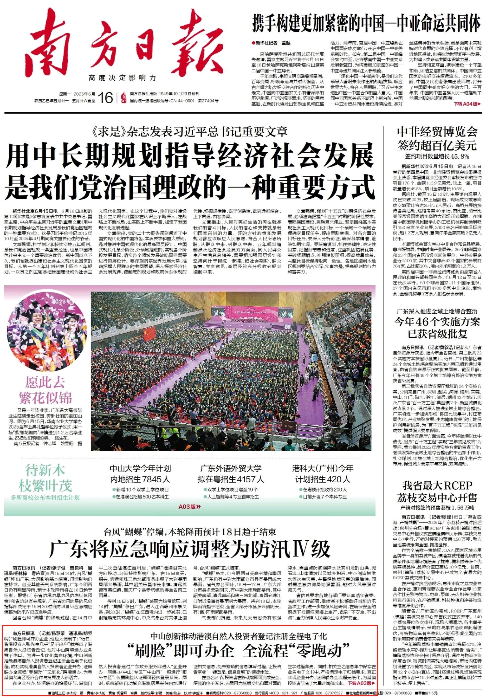 “刷脸即可开办企业,这也太便利了!”近日,香港投资人张先生几乎“足不出户”就完成了港澳自然人投资者登记,他对中山跨境通办业务赞不绝口。为进一步优化营商环境,中山创新推动港澳自然人投资者登记注册全程电子化进程,成功实现港澳自然人投资者企业开办、证照联办全流程“零跑动”“无纸化”跨境通办,为粤港澳大湾区经济合作与发展注入新活力。